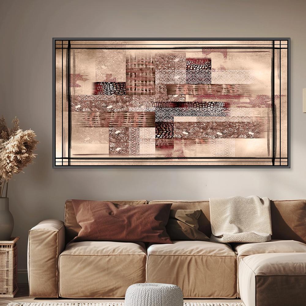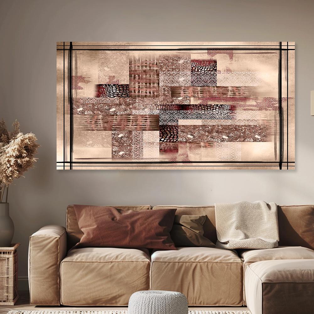 اكتشف مزيجاً فريداً من الفن التجريدي والتراث الشرقي مع لوحة "تراث معاصر" الجدارية، المصممة لإضفاء لمسة من الأصالة والرقي على مساحتك. تتميز هذه اللوحة بتكوين بصري غني من مربعات ومستطيلات متداخلة تحمل في طياتها أنماطاً وزخارف مستوحاة من الفن الإسلامي والشرقي، مع إحساس بـ "الكولاج" أو الترقيع الفني. تتجلى الألوان الترابية الدافئة في تدرجات متناغمة من البيج، البني الداكن، الرمادي، مع لمسات خفيفة من الأحمر الداكن (العنابي/البرغندي)، مما يمنحها عمقاً وتأثيراً بصرياً معقداً وجذاباً.